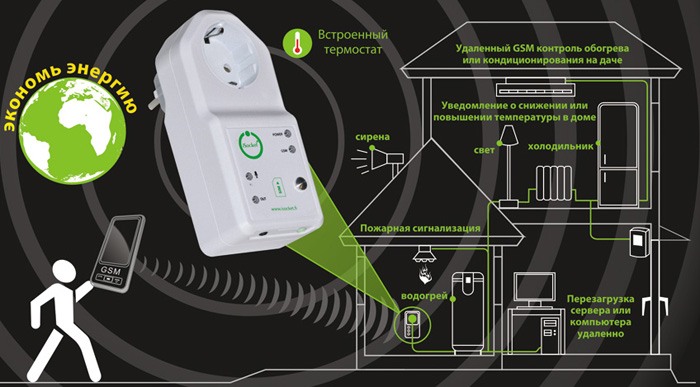 • Непрерывный контроль температуры. Gsm sms розетка iSocket 707 имеет встроенный термометр и датчик температуры, что позволяет удаленно управлять температурой. Достаточно подключить к розетке обогреватель, кондиционер, систему "теплый пол" и т.д. Вы всегда будете знать точную текущую температуру в помещении и сможете в любой момент включить обогрев или охлаждение, отдав соответствующую команду.