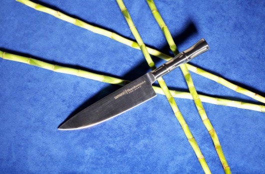 Samura Bamboo - кухонные ножи из современной однослойной японской стали твердостью 57-59 ед HRC. Уникальная металлическая рукоятка в форме бамбука препятствует скольжению и абсолютно гигиенична.
