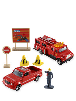 Игровой набор "МЧС", состоящий из 2 машин - пожарной и пикапа, фигурки спасателя и дорожных знаков, можно использовать как для соединения с другими элементами конструктора Мега Сити, так и для самостоятельной игры.