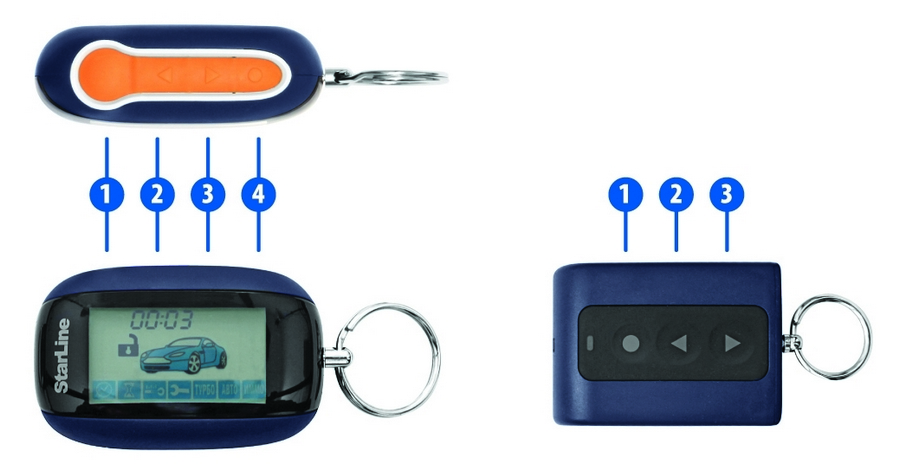У основного 4-х кнопочного брелока реализован, так называемый, принцип "основной кнопки". Основная кнопка активирует главную команду - включает режим охраны автомобиля. Меню брелока полностью на русском языке и имеет понятные иконки. В качестве дополнительных функций, в данной охранной системе реализована возможность контролировать заряд аккумулятора по напряжению, а так же выбор мелодии оповещения и регулировка громкости звуковых сигналов.