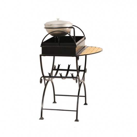 И это не единственные преимущества дачного кованого мангала МСК. Несмотря на изящность и компактность, его конструкция отличается особой прочностью. Стойка усилена элементами ручной ковки, а ящик мангала изготовлен из цельного листа жаростойкой стали толщиной 2 мм на гидравлическом прессе. Такая жаровня выдерживает высокие температурные нагрузки в течение долгого времени и не деформируется. А спереди и сбоку жаровни расположились 2 удобных деревянных столика (один из них съемный), которые можно использовать как подставки для посуды или вместо разделочных досок. В комплекте с мангалом вы также получите казан на 5 литров. В нем можно готовить плов или разогревать уже готовый шашлык.
