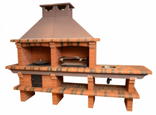 Садовая печь-барбекю из натурального кирпича Saunday 732 — лучший выбор для больших семей. Эта модель комплектуется стальным мангалом и плитой, так что вы сможете готовить 2 блюда одновременно: одно на решетке, шампурах или вертеле, другое в сковороде, казане или даже в коптильне (коптильня приобретается отдельно). Плюс к этому, печка снабжена большой кирпичной столешницей со встроенной мойкой, так что перед вами — полноценная садовая кухня.