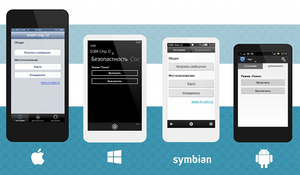Управление и настройка с помощью мобильного приложения. Мобильное приложение SOBR для смартфонов с ОС Android, iOS, WP8 позволяет легко управлять устройствами SOBR и настраивать их характеристики. Например, запросить координаты местоположения, включить режим охраны по движению, изменить время выхода на связь.