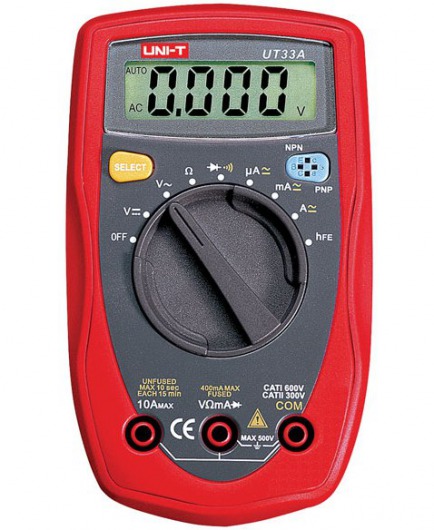 UNI-T UN33A - цифровой мультиметр. Служит для измерения напряжения постоянного и переменного тока, сопротивления, силы тока. Вывод информации осуществляется посредством жидкокристаллического экрана, а также световых и звуковых индикаторов. С данным устройством есть возможность проверить электрические цепи автомобиля максимально просто и быстро.