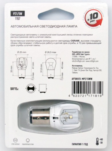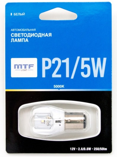 Светодиодная лампа MTF Light P21/5W 2.6/0.6W с уникальной конструкцией линзы отлично повторяет распространение света штатной лампы. Цвет свечения автолампы: белый.