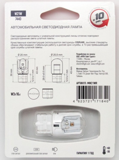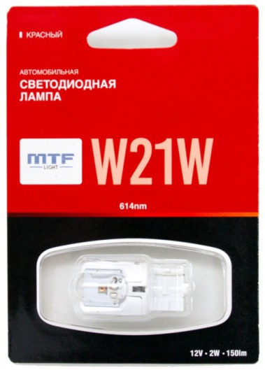 Светодиодная лампа MTF Light W21W 2W с уникальной конструкцией линзы отлично повторяет распространение света штатной лампы. Цвет свечения автолампы: красный.