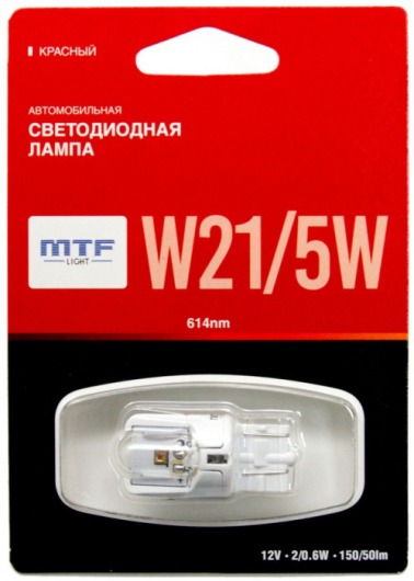 Светодиодная лампа MTF Light W21/5W 2/0.6W с уникальной конструкцией линзы отлично повторяет распространение света штатной лампы. Цвет свечения автолампы: красный.