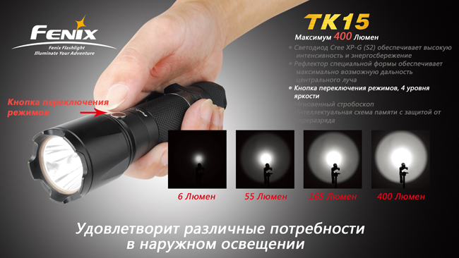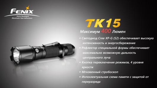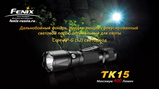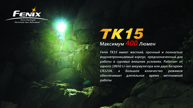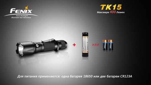 Fenix TK15 - один из самых ярких и многофункциональных тактических фонарей Fenix. Благодаря двум аккумуляторам CR123A или одному - 18650 вы сможете без потерь мощности использовать фонарь зимой в условиях низких температур. Fenix TK15 незаменимый на охоте фонарь с максимальной яркостью 400 люменов! Вы сможете освещать самые отдаленные объекты на расстоянии 252 метров.