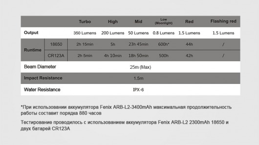 • Производитель утверждает, что от аккумулятора Fenix ARB-L2-2300 мАч (в комплекте) фонарь в состоянии проработать 880 ч.