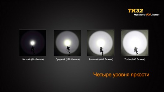Ведущий светодиод белого цвета позволяет получить световой поток до 900 люмен яркости. Этого достаточно, чтобы осветить территорию на расстояние до 400 м. Пользователям доступно 4 варианта яркости, в зависимости от которых находится время работы Fenix TK32 до момента замены элементов питания: