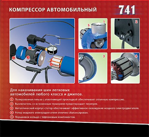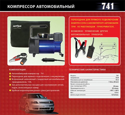 Автомобильный компрессор 741 - превосходная модель американских разработчиков, которая обладает действительно поразительной производительностью, мощностью, надежностью и безотказностью в работе. Компрессор прост в установке и эксплуатации. Использовать Вы его можете как для накачки шин, так и лодок и матрасов. Небольшой в размерах, он легко транспортируется и не занимает много места.
