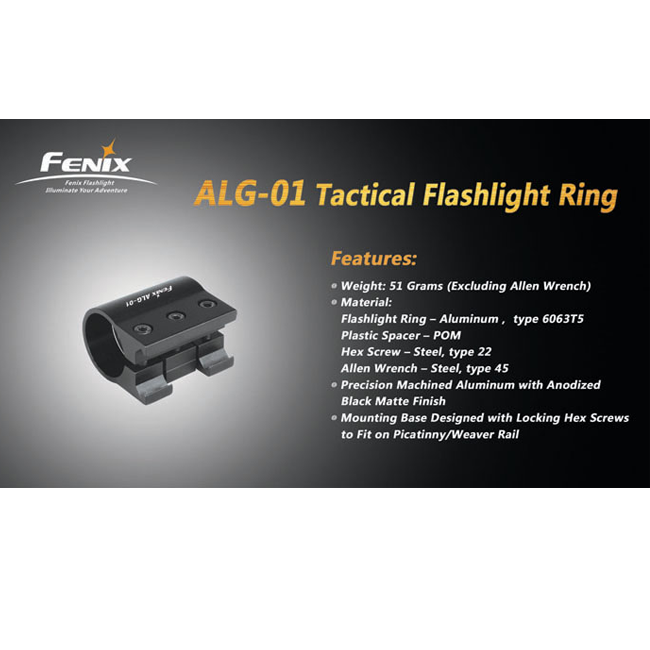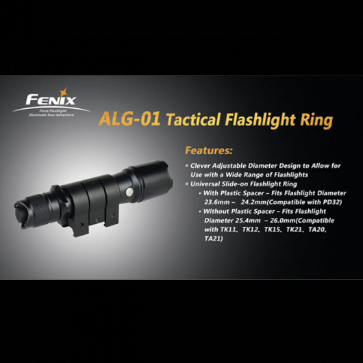 Изделие можно использовать с тактическими фонарями разного диаметра (для этого в наборе к креплению идет специальная пластиковая втулка). За счет универсальной раздвижной конструкции, крепление рассчитано на возможность установки фонарей разного диаметра. Материал кронштейна Fenix ALG-01 — авиационный алюминий с жестким анодированием поверхности. Такой аксессуар является не только прочным, но и стойким к истиранию, хорошо противостоит появлению царапин и механических повреждений. В зависимости от того, с фонарем какого диаметра будет использоваться крепление на планку Пикатинни, этот аксессуар используется самостоятельно или же в комплекте с пластиковой втулкой. Без втулки крепление подходит для фонарей таких моделей, как ТК 11, ТК 12, ТК 15, ТК21 — это фонари с диаметром корпуса 25,4-24,2 мм. Вместе со втулкой крепление будет совместимо с фонарем Fenix PD32 и другими моделями с диаметром корпуса 23,6-24,2 мм.