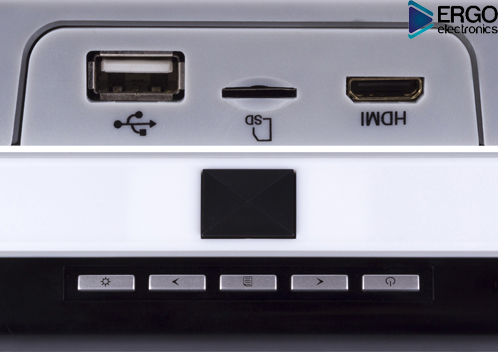 Особенностью модели ER17S является расположение выходов под флешку либо SD-карту непосредственно на корпусе потолочного монитора (в отличие от аналогичной по характеристикам модели ER173FH, у которого разъемы нужно выводить).