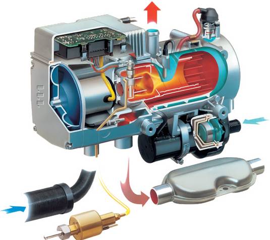 Прибор устанавливается в пространство системы циркуляции теплоносителя от двигателя. Тепловая энергия выходит из обменника автомобиля и распределяется по салону. То тепло, которое остается, используется для того, чтобы подогреть охлаждающую жидкость двигателя.