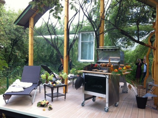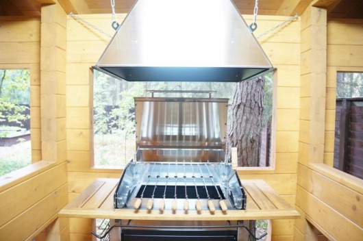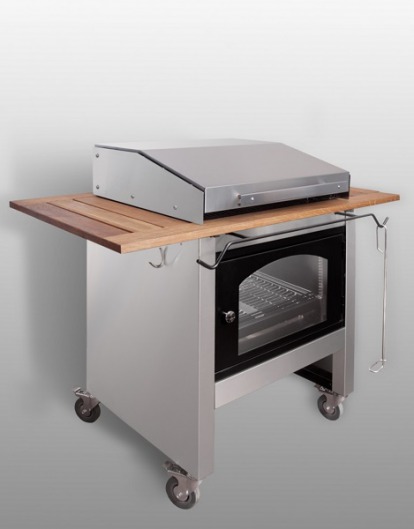 Уникальная функция запекания, не доступная в других моделях грилей, реализована благодаря откидной крышке с дополнительным отражателем. Регулировка высоты поддона с углем (дровами) выполняется при помощи поворотной ручки, находящейся над топкой. Гриль удобно передвигать по участку и даже ставить на наклонную плоскость благодаря блокируемым колесам.