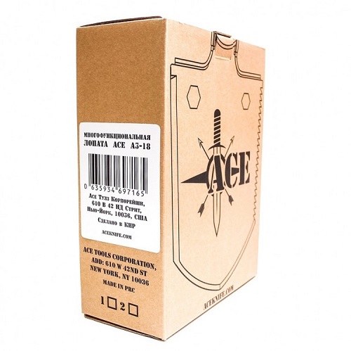 Инструмент изготовлен исключительно из качественных материалов, которые обеспечивают надёжность и долговечность изделия. Функциональные насадки, формирующие рукоять лопаты, выполнены из высокопрочного алюминиевого сплава, а само рабочее полотно — из высокоуглеродистой стали. Общая длина модели ACE A3-18 в рабочем состоянии равна 78.8см, ширина полотна — 12.8см.