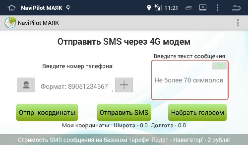 Кроме того, в приложении предусмотрена функция отправки SMS с магнитолы, Вы можете отправить свои координаты друзьям или любой текст (с установленной в модеме SIM карты). Обратите внимание: на данный момент NaviPilot МАЯК работает только с модемом и SIM картой от Мегафон, которые можно дополнительно приобрести у нас выбрав в поле над ценой соответствующий пункт.