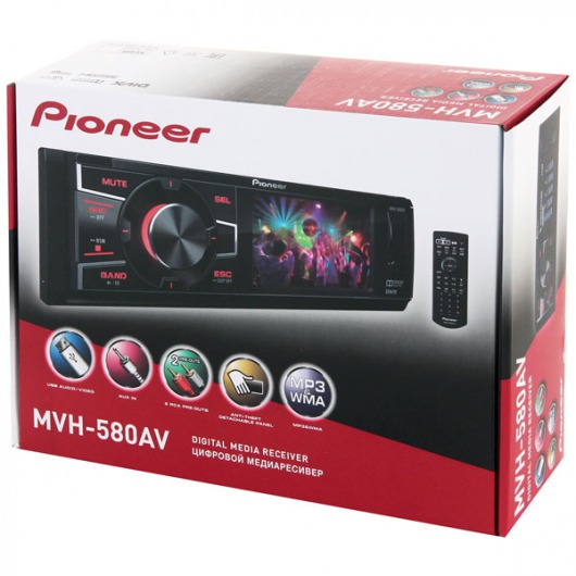 Автомобильная магнитола 1din Pioneer MVH 580AV с  экраном 3 дюйма – очень функциональное устройство. У автомагнитолы есть широкий набор мультимедийных технологий, которые позволяют выжать из устройства по максимуму. Ресивер способен выдавать звук на 4 колонки по 50 ватт. Есть возможность сохранения до 18 радиостанций на цифровом радио-тюнере. Кроме того, реализована возможность прослушивания аудиозаписей через карту памяти.
