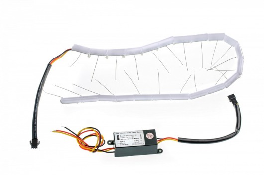 Гибкие дневные ходовые огни (DRL) Optima предназначена для установки в фары автомобиля. Может работать в 2-х режимах: для подсветки и индикации поворота, а также в режиме дневных ходовых огней (DRL). При повороте лента светит желтым светом, при движении прямо — белым. Диодная лента имеет гибкий корпус, поэтому может быть согнута в любом направлении.