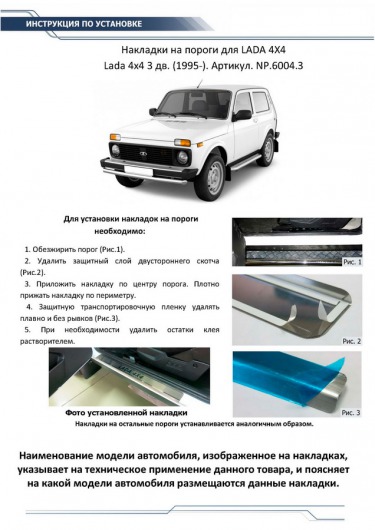 Данные накладки на внутренние пороги «Риваль» разработаны специально для автомобилей Lada 4Х4 от 1995 г.в., 3-дверная. и полностью повторяют их геометрию. Кроме того, накладки порогов двери Rival очень легко и быстро устанавливаются. И при этом надежно крепятся за счет плотного прилегания морозостойкого скотча.