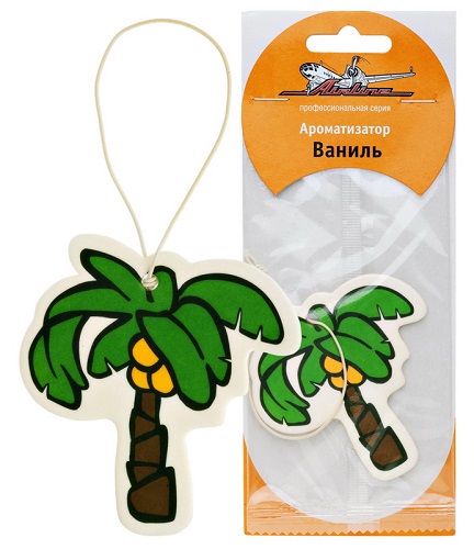 Ароматизатор воздуха в салон авто выполнен в форме пальмы и изготавливается из плотного картона. Такой аксессуар не только украсит салон автомобиля, но и создаст приятный аромат и избавит салон машины от неприятного запаха. Данный освежитель воздуха для автомобиля имеет аромат «Ваниль», запах от него не резкий, но довольно стойкий.