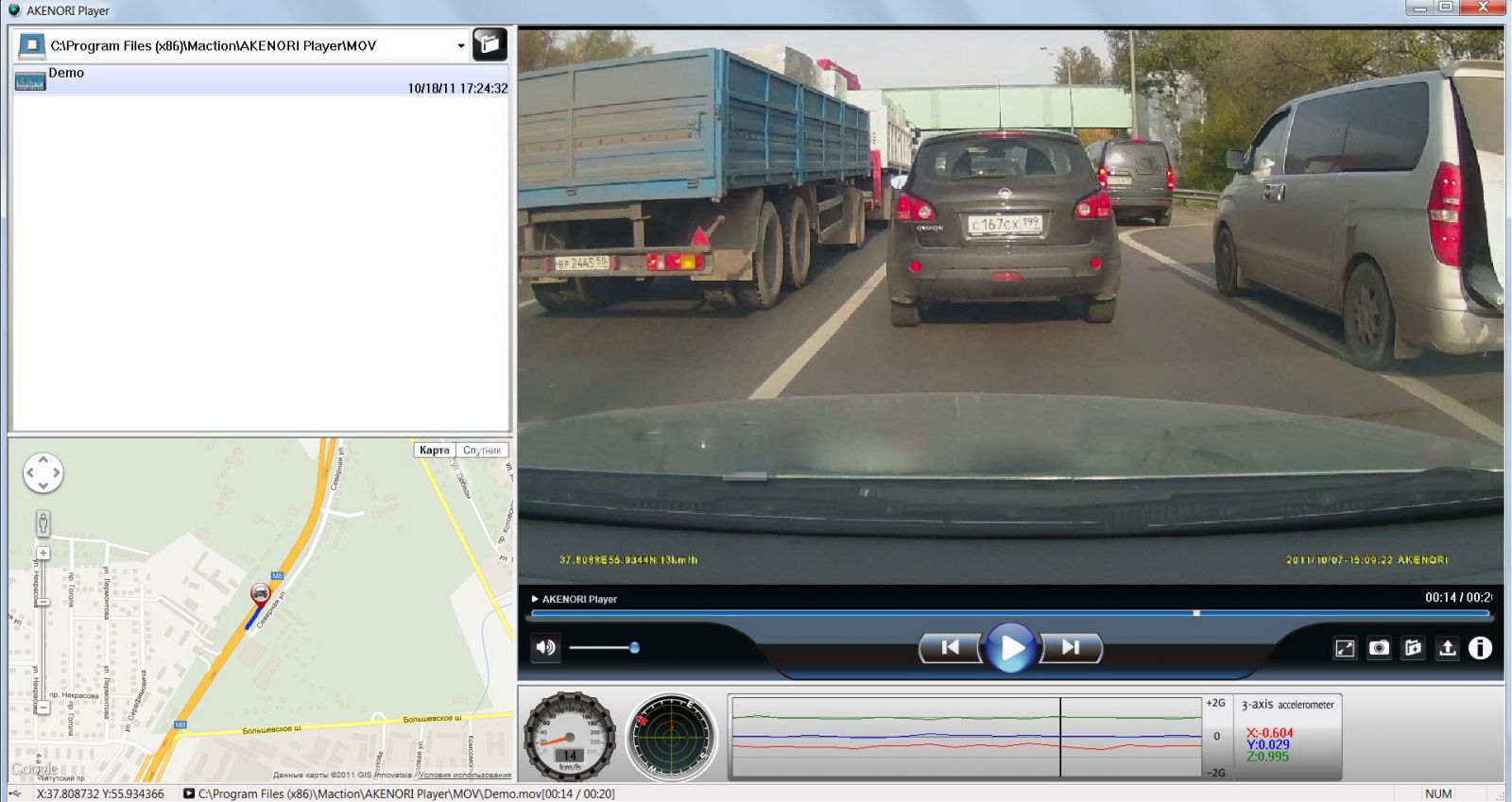 Благодаря данной программе можно не только просмотреть видео, но и сохранить его, а так же захватить отдельные кадры. Кроме того, вы увидите все изменения скорости автомобиля, режимы разгона и торможения, плюс все воздействия на автомобиль. А самое главное - у вас есть возможность увидеть весь пройденный путь на данном отрезке записи (функция "черного ящика"). Эта воможность уникальна и в других DVR не встречается!