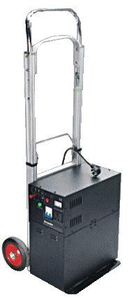 Инвертор выдает 220В из постоянного тока 12В. Вы можете использовать свинцово-кислотные, гелевые, AGM, Li-FE-Pol (литий фосфатные) аккумуляторы, общей емкостью не менее 100А*ч. Делается это так: стандартный аккумулятор емкостью 100А*ч помещается в металлический кожух, который монтируется вместе с основным модулем станции в монолитный блок. Вся конструкция имеет внушительные размеры и приличный вес, поэтому в состав комплекса включена тележка на колесиках. С ней вам будет гораздо проще передвигать станцию.