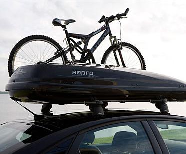 Автомобильный бокс Hapro имеет металлические профили в днище и комплекс рычагов двойного действия с пружинным механизмом. Функции рычагов: