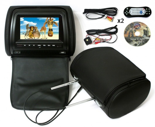 Для установки подголовников Вам нужно отрегулировать расстояние между металлическими ножками в пределах от 11 до 20 сантиметров и подобрать уплотнительные втулки подходящего диаметра. Последние есть в комплекте поставки. Кроме этого, с подголовниками Вы получите диск на 300 игр с проводным джойстиком, что точно обрадует Ваших маленьких пассажиров.