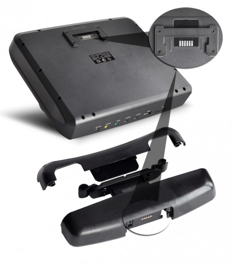 Управление и настройка прибора осуществляется при помощи сенсорных кнопок и пульта дистанционного управления. Этот монитор устанавливается на подголовник за счет специального кронштейна, который имеет возможность регулировки расстояния между креплениями (от 12 до 18 см), что обеспечивает надежную фиксацию на опорах штатного подголовника. В комплект поставки входит особый набор для крепления монитора на ножки, диаметр которых 10, 12 и 14 мм.