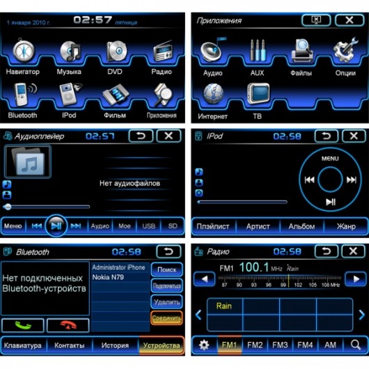 Кроме прочего, с помощью этого головного устройства вы сможете выходить в интернет и пользоваться функцией отображения пробок на дороге. Благодаря этой функции навигатор в вашей магнитоле будет прокладывать дорогу с учетом пробок, т.е. выбирать для вас самый быстрый и оптимальный путь. Чтобы появились доступ в Интернет и функция отображения кнопок, нужен модем Intro GPS 3G. Модем не входит в стандартную комплектацию и приобретается отдельно.