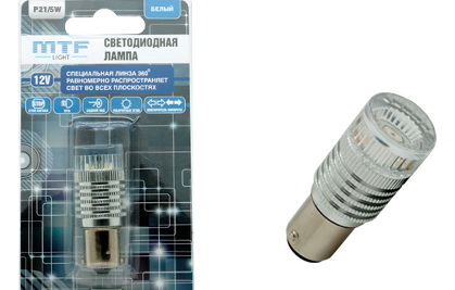 MTF P21/5W - светодиодная энергоэкономичная лампа. Цвет света - белый. Свет очень яркий, но при этом отлично воспринимается человеческим глазом. Линза 360° полностью освещает расположенную у основания лампы площадь отражателя и точно повторяет распространение света штатной лампы.