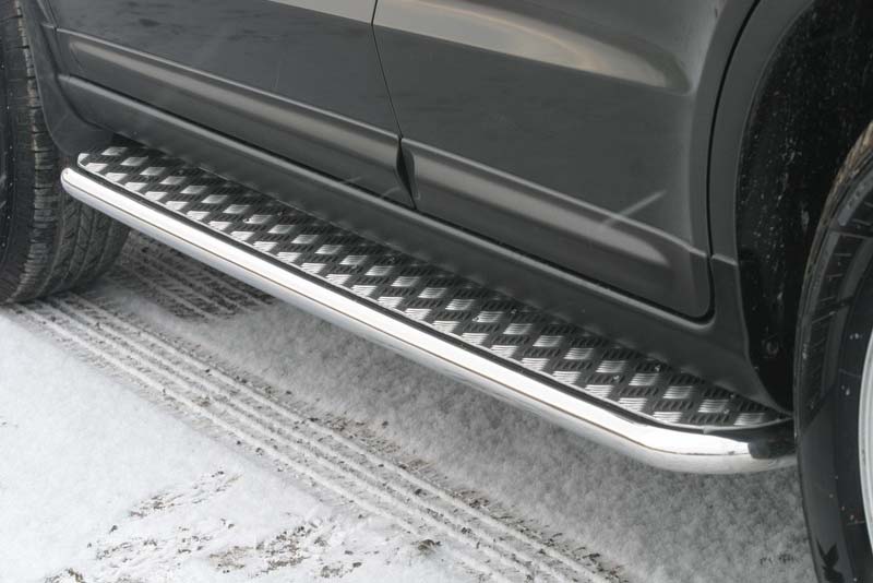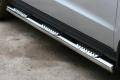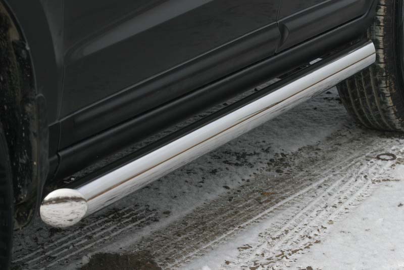 Боковые пороги на Hyundai Tucson из нержавеющей стали диаметром 60 мм не боятся коррозии, сколов и царапин и выдерживают большие нагрузки. Боковые подножки-пороги с листом сделаны специально для автомобилей Hyundai Tucson, легко устанавливаются и стильно смотрятся.